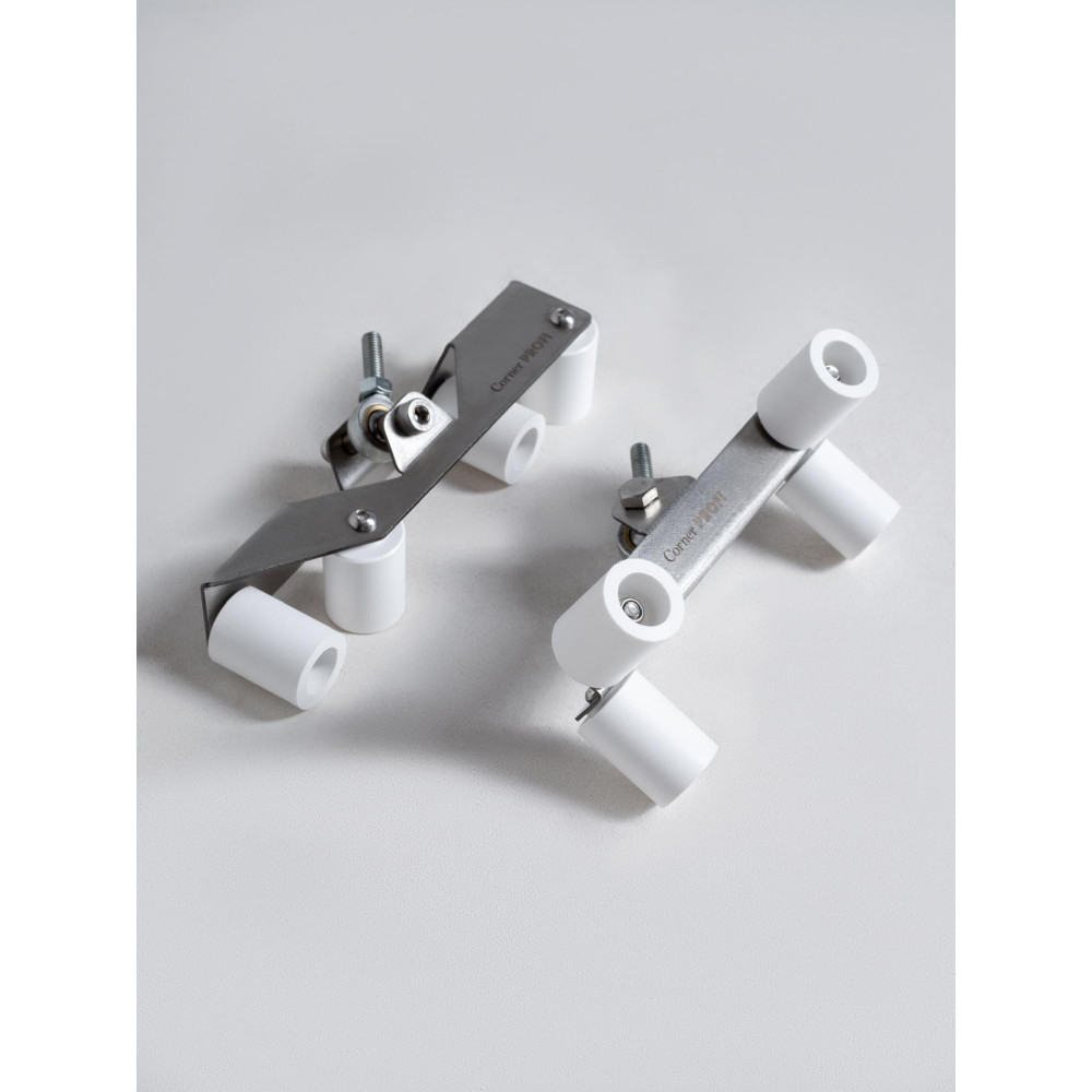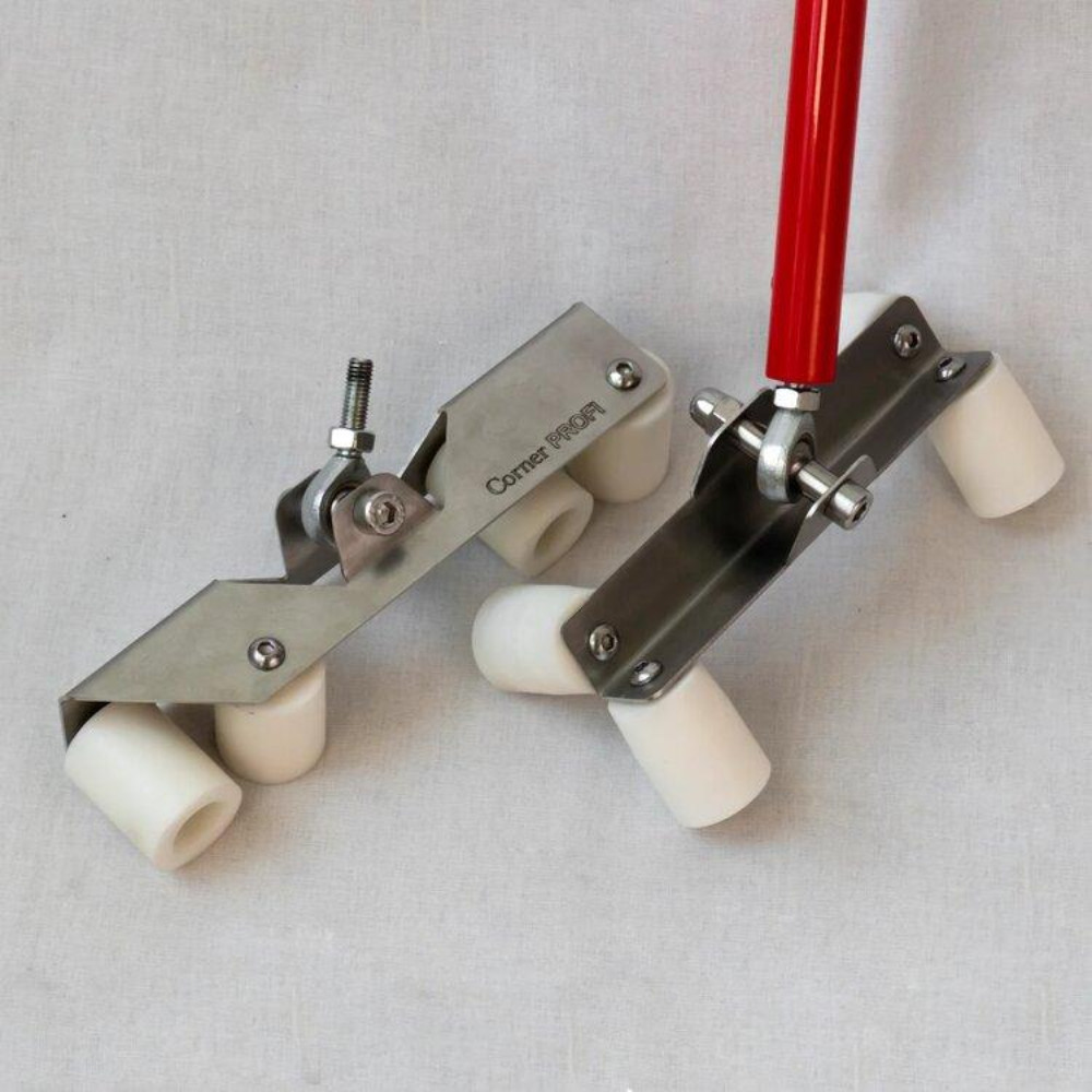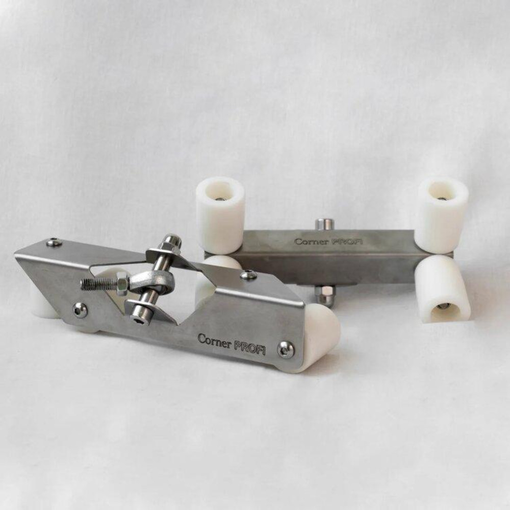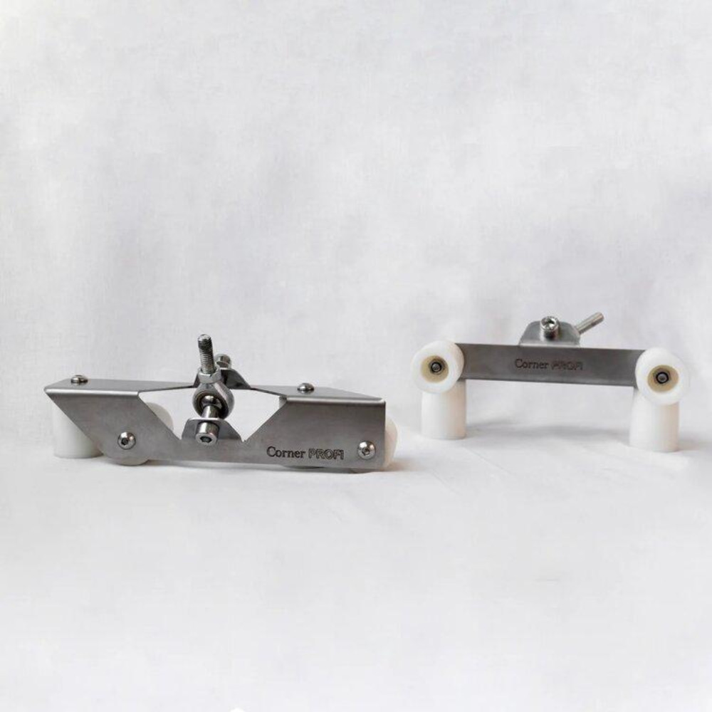 Комплект Corner Profi изготовлен с использованием высококачественных материалов, обеспечивая надежность и долгий срок службы. Корпус роллеров и крепеж выполнены из нержавеющей стали, что гарантирует устойчивость к коррозии и высокую прочность. Рукоятки изготовлены из алюминия и покрыты порошковой окраской для удобства и долговечности.