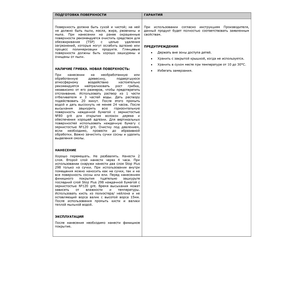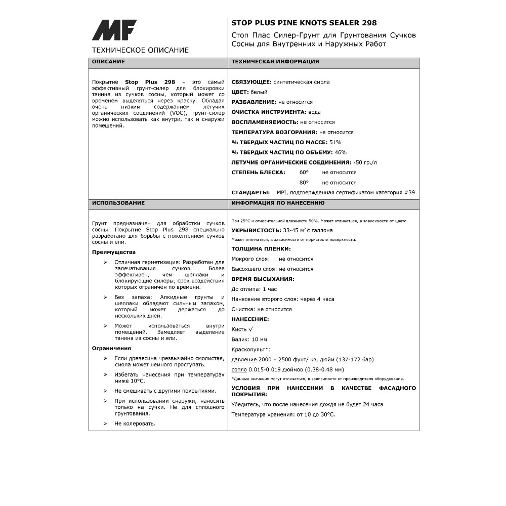 Самый эффективный грунт-силер для блокировки танина из сучков сосны, который может со временем выделяться через краску. Обладая очень низким содержанием летучих органических соединений (VOC), грунт-силер можно использовать как внутри, так и снаружи помещений. MF Paints Stop Plus 298
