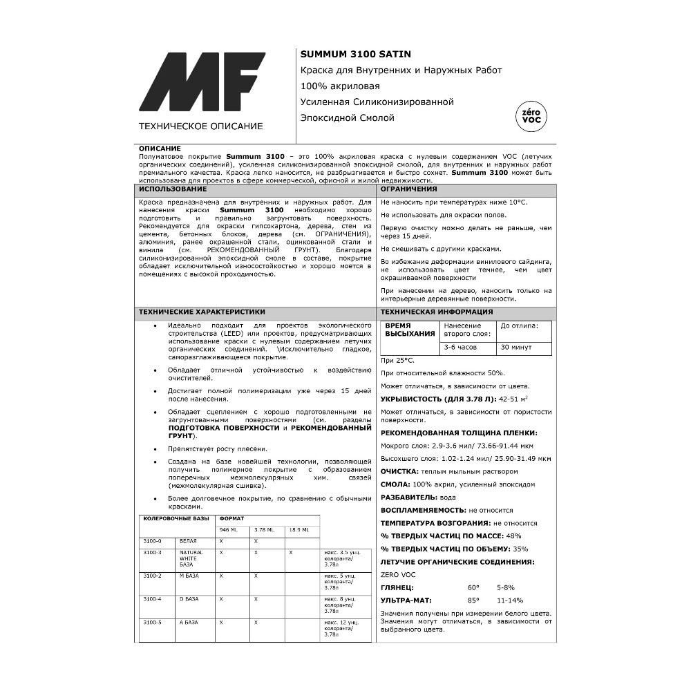MF Paints Summum 3100 Satin - это эпитом качества в мире красок. Эта премиальная акриловая краска предназначена для внутренних и наружных работ, удивляя своими выдающимися характеристиками. Содержа ние летучих органических соединений (VOC) сведено к нулю, что делает ее идеальным выбором для проектов экологичного строительства и тех, кто стремится к долгосрочному и стойкому покрытию.