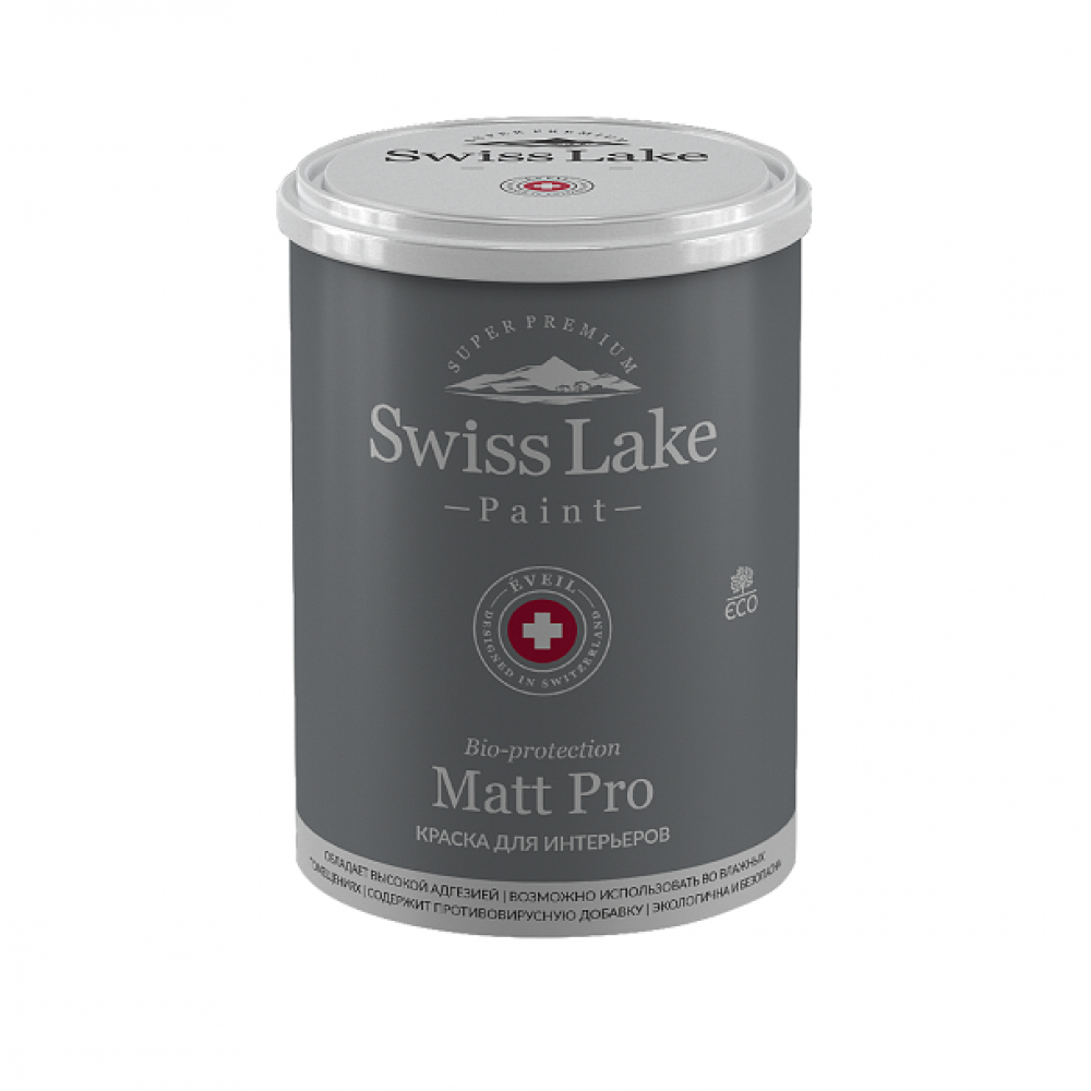 Матовая краска для внутренних работ. Предназначена для окраски стен и потолков в любых помещениях, в том числе с высокой эксплуатационной нагрузкой и повышенной влажностью. Swiss Lake Matt Pro