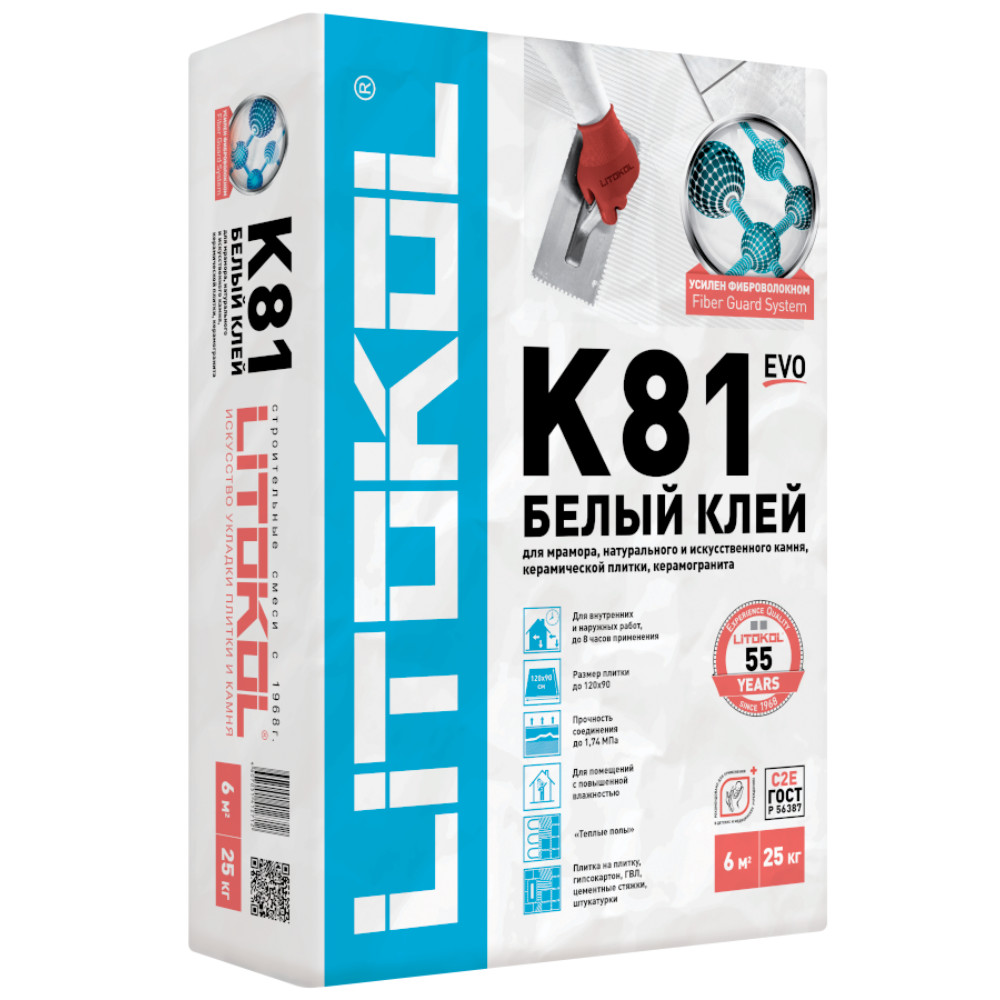 Литокол Литофлекс K81 (класс C2 E) – это белый фиброармированный клей, предназначенный для укладки мрамора, камня, керамической плитки и керамогранита размером до 120х90 см. Продукт обладает рядом ключевых свойств, которые делают его универсальным и эффективным материалом для облицовки различных поверхностей: