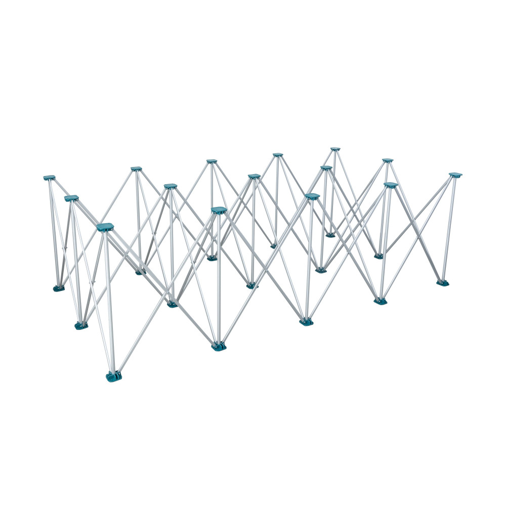 Состоящее из алюминиевых труб опорное подстолье обеспечивает повышенную прочность и жесткость конструкции. Его модульный дизайн позволяет легко собирать столы различных конфигураций, а также увеличивать их размеры при необходимости с помощью дополнительных элементов.